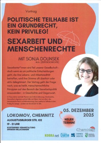 5. Dezember 2025 | 19:00 - 21:00 | LOKOMOV | VortragVortrag: Sexarbeit und Menschenrechte mit Sonja Dolinsek (M.A. Zeitgeschichte)Sexarbeiter:innen sind Teil unserer Gesellschaft – doch wenn es um politische Entscheidungen geht, die ihre Lebens- und Arbeitsrealität betreffen, wird ihre Stimme oft überhört oder aktiv delegitimiert. Der Vortrag geht der Frage nach, was es heißt, menschenrechtliche Prinzipien auf den Bereich der Sexarbeitspolitik anzuwenden – in Geschichte und Gegenwart.